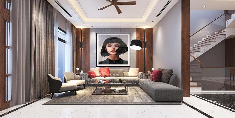 Thiết kế nội thất phòng khách hiện đại, tối giản đi những đường nét chi tiết mà tập trung vào công năng sử dụng, mang lại không gian tiếp khách trẻ trung, năng động mà sang trọng