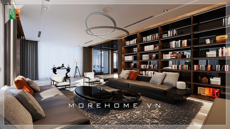 Sofa văng da cao cấp màu nâu trầm tinh tế với lối thiết kế hiện đại thật ấn tượng trong phòng khách của biệt thự, nhà phố