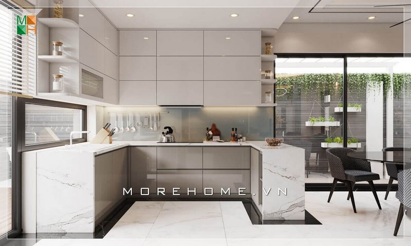Tủ bếp chữ U thoải mái để cất trữ đồ đạc cùng với bàn bếp mặt đá trắng tinh tế trẻ trung thuận lợi để vệ sinh, lại chịu lực, chịu nhiệt tốt trong không gian phòng bếp hiện đại