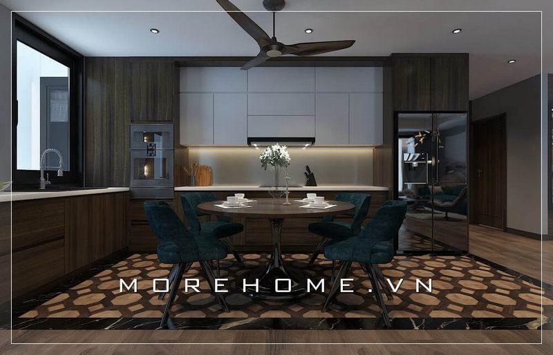 Không gian phòng bếp hiện đại với mẫu tủ bếp ốp màu trắng, mặt bếp đá solid surface màu trắng mang đến không gian nấu nướng tiện nghi cho người nội trợ