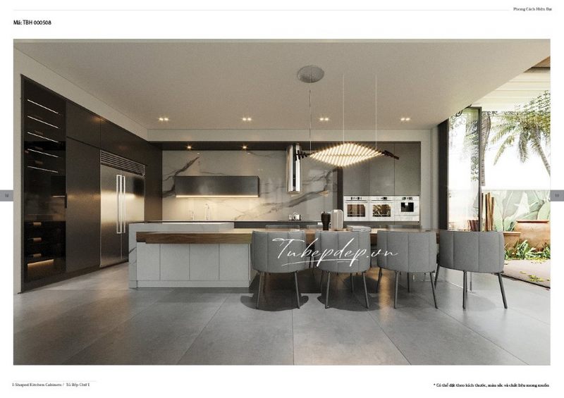 Để thể hiện trọn vẹn vẻ đẹp hiện đại của căn bếp biệt thự, nhà phố cao cấp, các KTS sử dụng đá màu trắng vân mây ốp mảng tường lớn đầy ấn tượng