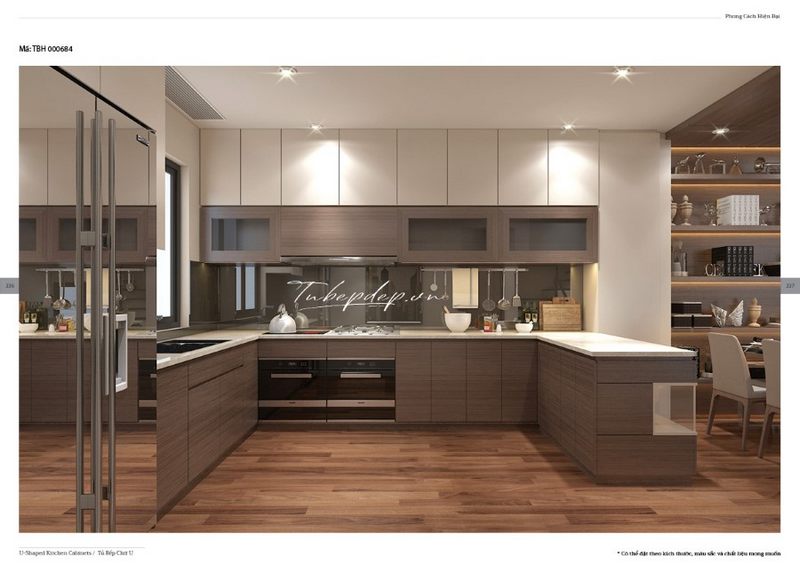 Mẫu tủ bếp gỗ hiện đại, mặt bếp ốp đá màu trắng vân mây tinh tế giúp không gian phòng bếp sạch sẽ và thoáng mát hơn