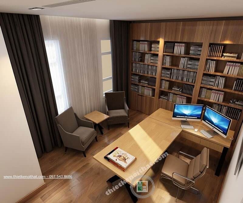 Mẫu kệ tủ sách được thiết kế âm tượng tạo không gian rộng, thoải mái hơn cho phòng làm việc