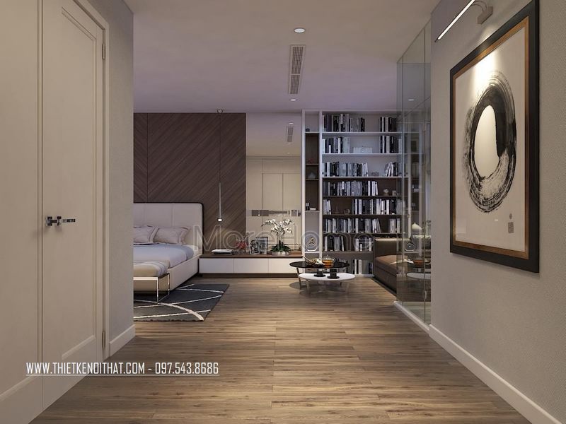 Kệ sách gỗ công nghiệp phòng ngủ được thiết kế âm tường hiện đại, đơn giản