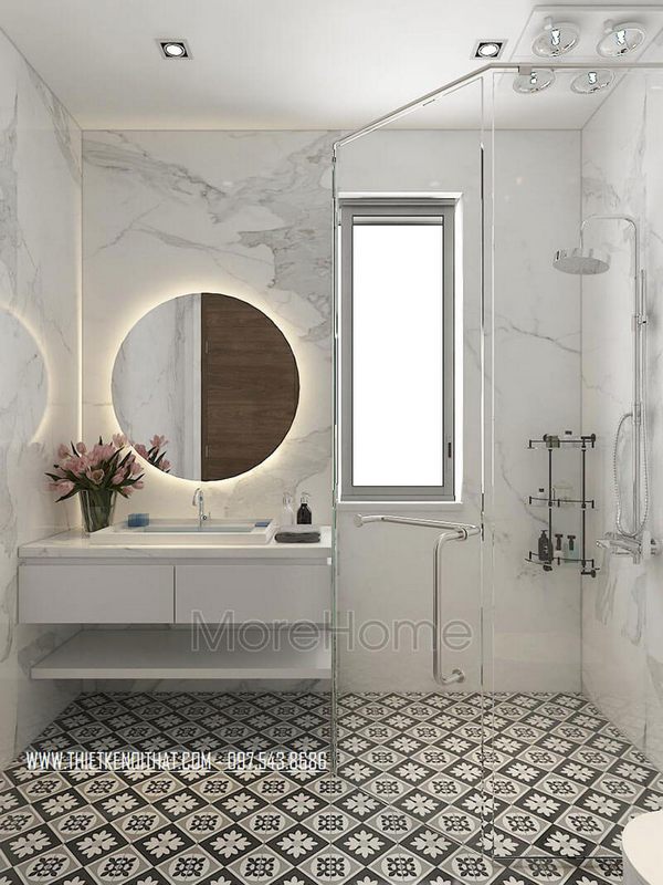 Tủ kệ lavabo kết hợp gương tròn tạo ấn tượng cho không gian phòng tắm
