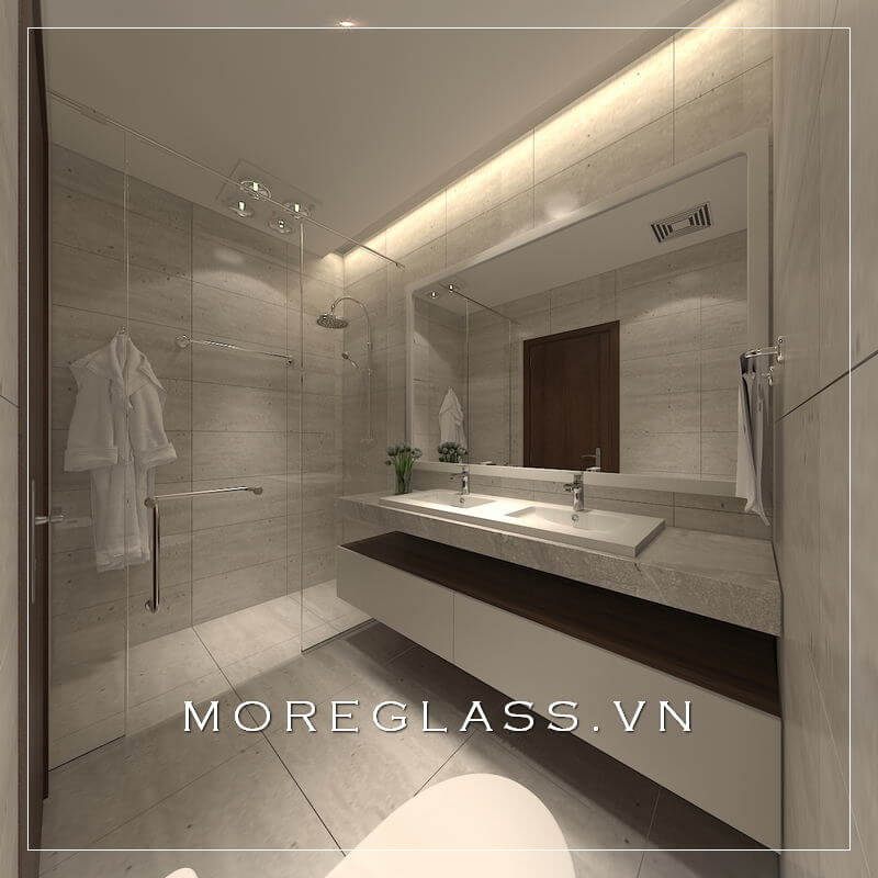 Mẫu kệ tủ lavabo phòng tắm khách sạn hiện đại với trắng tinh tế, sang trọng.