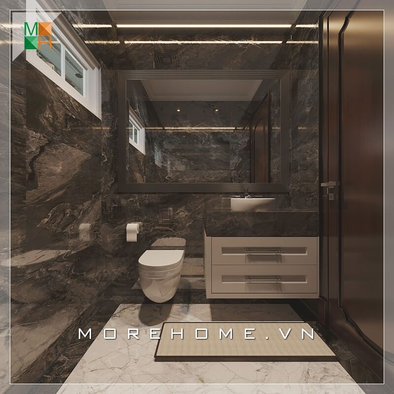Mẫu tủ lavabo gỗ công nghiệp hiện đại, mặt tủ ốp đá cao cấp màu đen nổi bật cho không gian phòng tắm