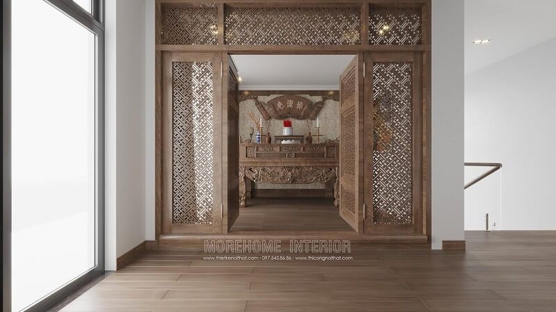Mẫu cửa gỗ cao cấp có thiết kế phần khung ngoài bằng gỗ tự nhiên và bên trong được làm bằng các điệu nằng vách cnc thay vì tấm cửa gỗ truyền thống giúp tạo nên sự sang trọng và tinh tế cho không gian phòng thờ.