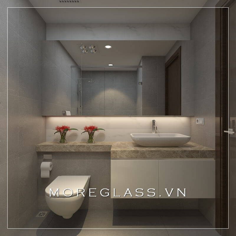 Để tạo sự rộng rãi cho không gian căn phòng, hãy lựa chọn đá tự nhiên ốp mặt bàn lavabo kết hợp với tủ gỗ đồ đơn giản và gương trang trí phòng vệ sinh hình chữ nhật.